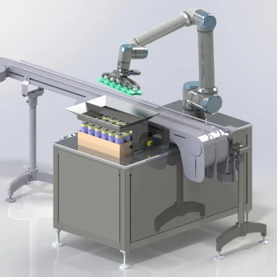 Mounted on a rugged stainless-steel frame, it offers up to 1300mm reach and a 12.6kg payload, using ultra-light 3D carbon-printed suction cups that preserve lifting capacity. It can pick 12 cans per cycle for 24-can trays, running about four trays per minute, and also works for RSC cases.